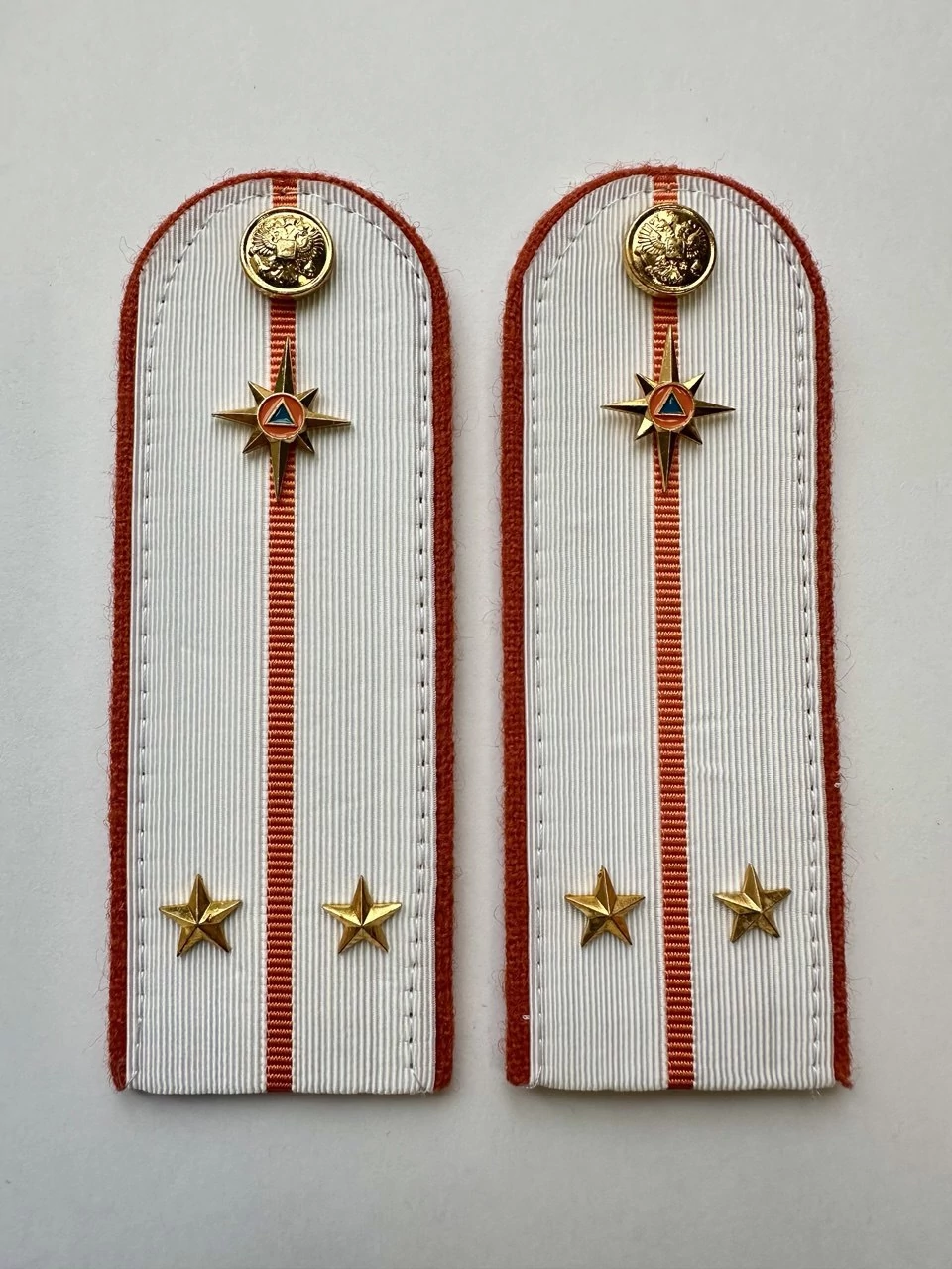 Погоны МЧС на рубашку 14х5 см (в сборе) укомплектованные с фурнитурой. Основа: КАРТОН. Материал: Погонная лента (полиэстер 100%). Ведомство: МЧС. Цвет: белый (уставной МЧС), Оранжевый. Погоны МЧС изготовлены в форме прямоугольника, верхние края которого закруглены. Подложка выполнена из картона, который защищает изделия от деформации во время носки. Для крепления погон к форме на изнаночной стороне пришита шлевка из ткани. Лицевая поверхность обстрочена красивым тонким шелковым галуном цвета морской волны. Окантовка погон выполнена в оранжевом цвете.