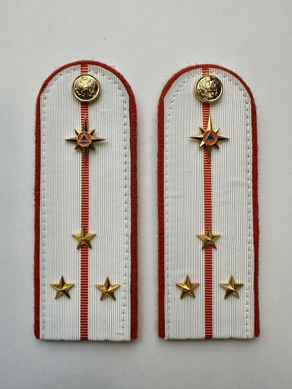 Погоны МЧС на рубашку 14х5 см (в сборе) укомплектованные с фурнитурой. Основа: КАРТОН. Материал: Погонная лента (полиэстер 100%). Ведомство: МЧС. Цвет: белый (уставной МЧС), Оранжевый. Погоны МЧС изготовлены в форме прямоугольника, верхние края которого закруглены. Подложка выполнена из картона, который защищает изделия от деформации во время носки. Для крепления погон к форме на изнаночной стороне пришита шлевка из ткани. Лицевая поверхность обстрочена красивым тонким шелковым галуном цвета морской волны. Окантовка погон выполнена в оранжевом цвете.