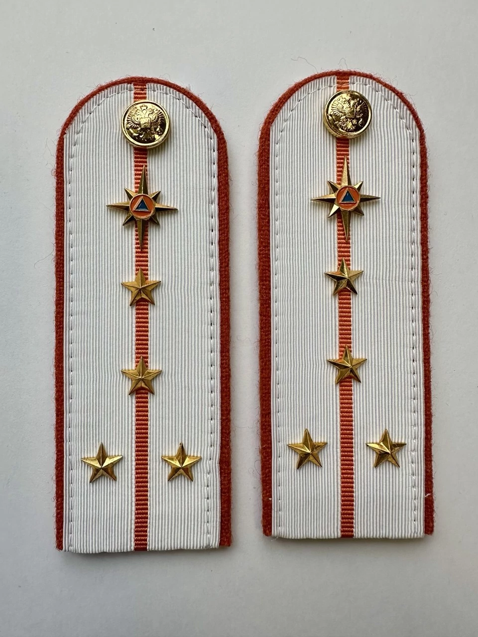 Погоны МЧС на рубашку 14х5 см (в сборе) укомплектованные с фурнитурой. Основа: КАРТОН. Материал: Погонная лента (полиэстер 100%). Ведомство: МЧС. Цвет: белый (уставной МЧС), Оранжевый. Погоны МЧС изготовлены в форме прямоугольника, верхние края которого закруглены. Подложка выполнена из картона, который защищает изделия от деформации во время носки. Для крепления погон к форме на изнаночной стороне пришита шлевка из ткани. Лицевая поверхность обстрочена красивым тонким шелковым галуном цвета морской волны. Окантовка погон выполнена в оранжевом цвете.