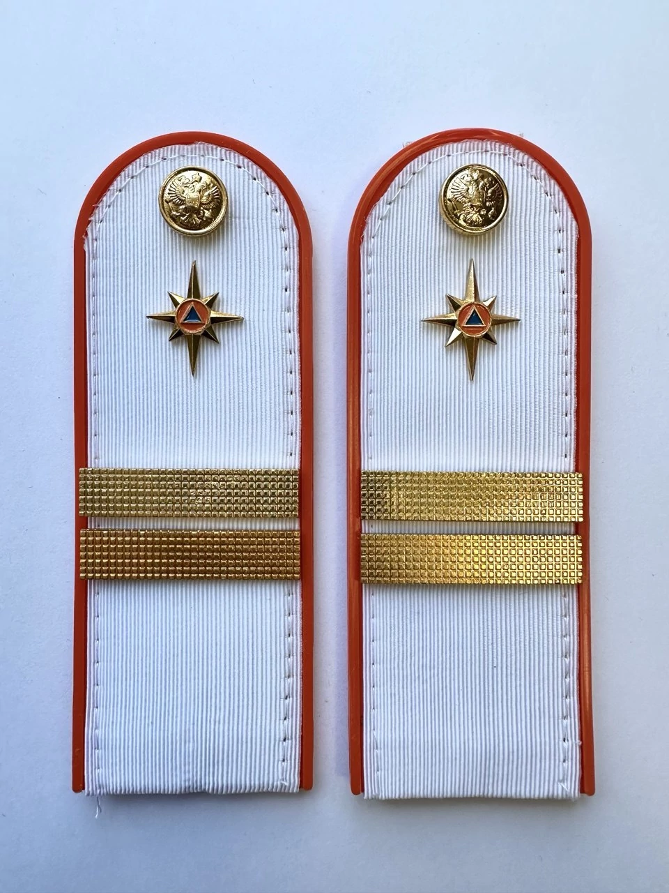 Погоны МЧС на рубашку 14х5 см (в сборе) укомплектованные с фурнитурой. Основа: ПЛАСТИК. Материал: Погонная лента (полиэстер 100%). Ведомство: МЧС. Цвет: белый (уставной МЧС), Оранжевый. Погоны МЧС изготовлены в форме прямоугольника, верхние края которого закруглены. Подложка выполнена из пластика, который защищает изделия от деформации во время носки. Для крепления погон к форме на изнаночной стороне пришита шлевка из ткани. Лицевая поверхность обстрочена красивым тонким шелковым галуном цвета морской волны. Окантовка погон выполнена в оранжевом цвете.