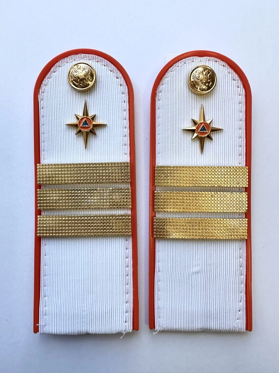 Погоны МЧС на рубашку 14х5 см (в сборе) укомплектованные с фурнитурой. Основа: ПЛАСТИК. Материал: Погонная лента (полиэстер 100%). Ведомство: МЧС. Цвет: белый (уставной МЧС), Оранжевый. Погоны МЧС изготовлены в форме прямоугольника, верхние края которого закруглены. Подложка выполнена из пластика, который защищает изделия от деформации во время носки. Для крепления погон к форме на изнаночной стороне пришита шлевка из ткани. Лицевая поверхность обстрочена красивым тонким шелковым галуном цвета морской волны. Окантовка погон выполнена в оранжевом цвете.