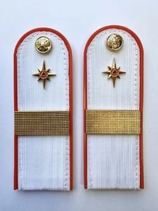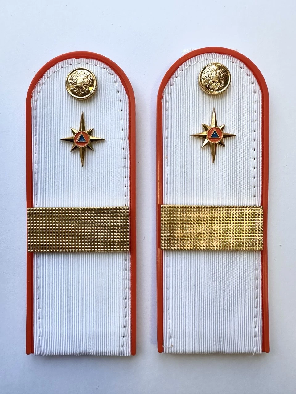 Погоны МЧС на рубашку 14х5 см (в сборе) укомплектованные с фурнитурой. Основа: ПЛАСТИК. Материал: Погонная лента (полиэстер 100%). Ведомство: МЧС. Цвет: белый (уставной МЧС), Оранжевый. Погоны МЧС изготовлены в форме прямоугольника, верхние края которого закруглены. Подложка выполнена из пластика, который защищает изделия от деформации во время носки. Для крепления погон к форме на изнаночной стороне пришита шлевка из ткани. Лицевая поверхность обстрочена красивым тонким шелковым галуном цвета морской волны. Окантовка погон выполнена в оранжевом цвете.