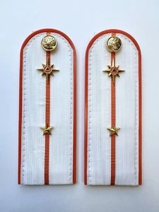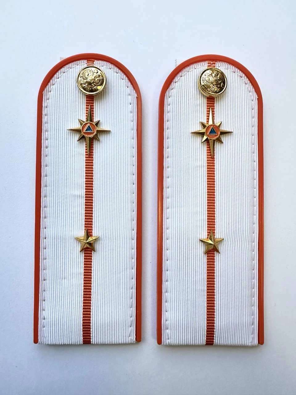 Погоны МЧС на рубашку 14х5 см (в сборе) укомплектованные с фурнитурой. Основа: ПЛАСТИК. Материал: Погонная лента (полиэстер 100%). Ведомство: МЧС. Цвет: белый (уставной МЧС), Оранжевый. Погоны МЧС изготовлены в форме прямоугольника, верхние края которого закруглены. Подложка выполнена из пластика, который защищает изделия от деформации во время носки. Для крепления погон к форме на изнаночной стороне пришита шлевка из ткани. Лицевая поверхность обстрочена красивым тонким шелковым галуном цвета морской волны. Окантовка погон выполнена в оранжевом цвете.