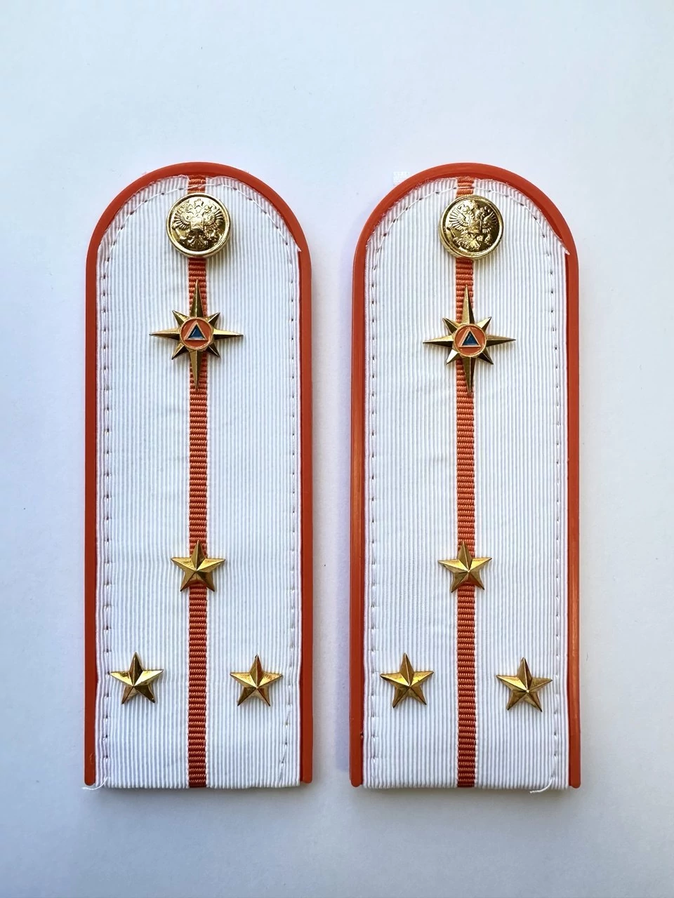 Погоны МЧС на рубашку 14х5 см (в сборе) укомплектованные с фурнитурой. Основа: ПЛАСТИК. Материал: Погонная лента (полиэстер 100%). Ведомство: МЧС. Цвет: белый (уставной МЧС), Оранжевый. Погоны МЧС изготовлены в форме прямоугольника, верхние края которого закруглены. Подложка выполнена из пластика, который защищает изделия от деформации во время носки. Для крепления погон к форме на изнаночной стороне пришита шлевка из ткани. Лицевая поверхность обстрочена красивым тонким шелковым галуном цвета морской волны. Окантовка погон выполнена в оранжевом цвете.