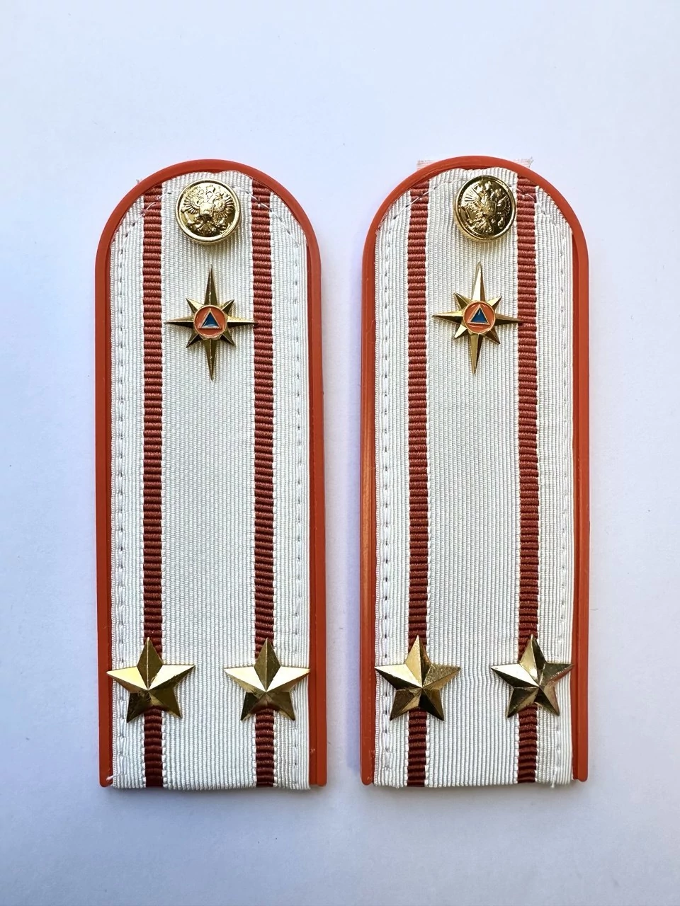 Погоны МЧС на рубашку 14х5 см (в сборе) укомплектованные с фурнитурой. Основа: ПЛАСТИК. Материал: Погонная лента (полиэстер 100%). Ведомство: МЧС. Цвет: белый (уставной МЧС), Оранжевый. Погоны МЧС изготовлены в форме прямоугольника, верхние края которого закруглены. Подложка выполнена из пластика, который защищает изделия от деформации во время носки. Для крепления погон к форме на изнаночной стороне пришита шлевка из ткани. Лицевая поверхность обстрочена красивым тонким шелковым галуном цвета морской волны. Окантовка погон выполнена в оранжевом цвете.