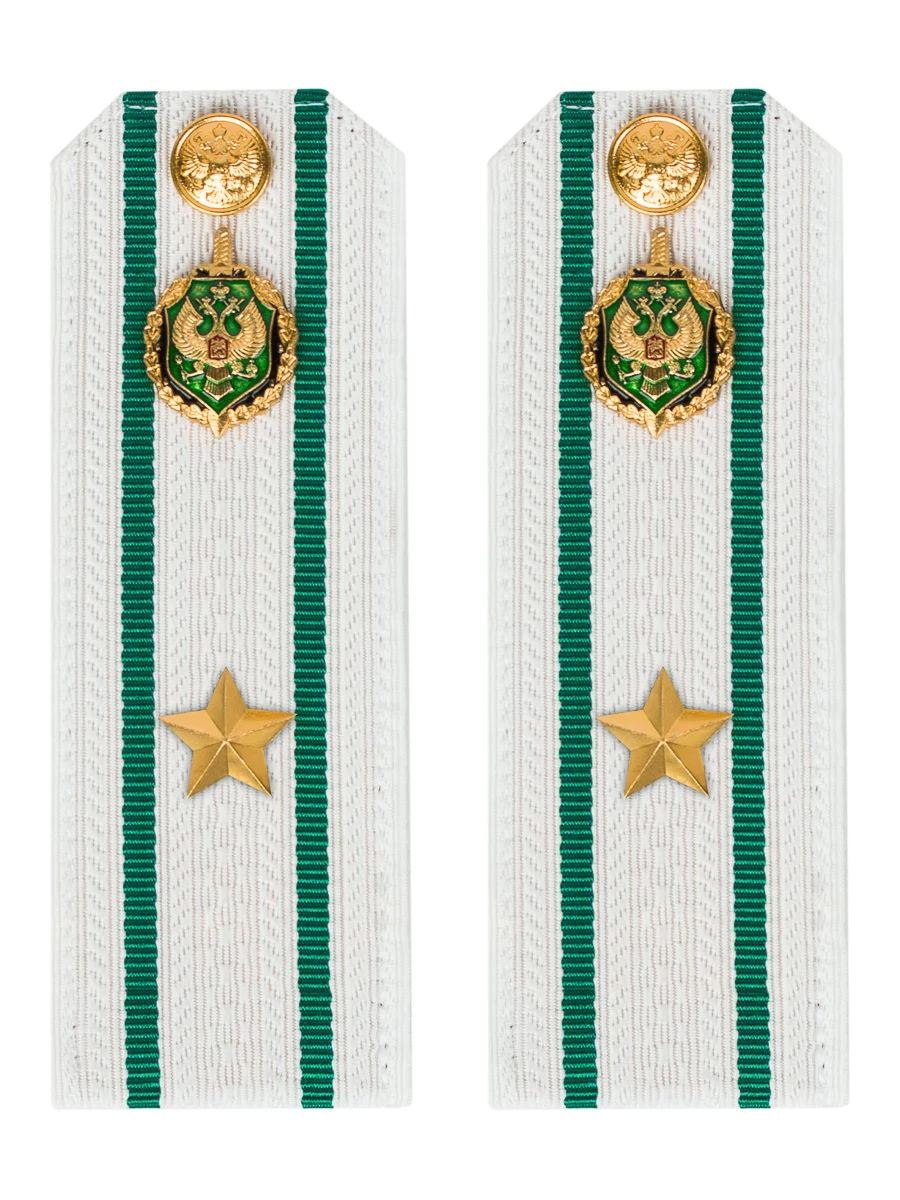 Размер 14 см на 5 см. Толщина 1 мм. Погоны ПС ФСБ ткань жаккард белого цвета с зеленым просветом на картонной основе. Погоны идут сразу в сборе с металлической фурнитурой из латуни и застежкой кляммером. При креплении жестких погон необходимо использовать застежку-кляймер. Необходимо продеть ленту погона в специальные петли на уставной форме.