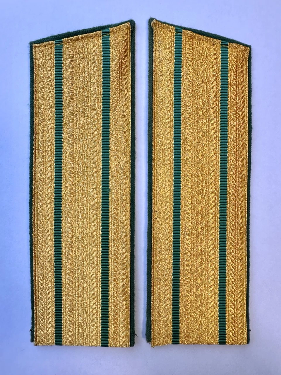 Погоны парадные золотого цвета для Пограничной службы ФСБ два просвета с кляммерами в комплекте, верх - трапеция. Основа - картон Материал: вискоза,галун,шерсть Способ крепления: пришивной Длина: 14 см Ширина: 5,2 см.