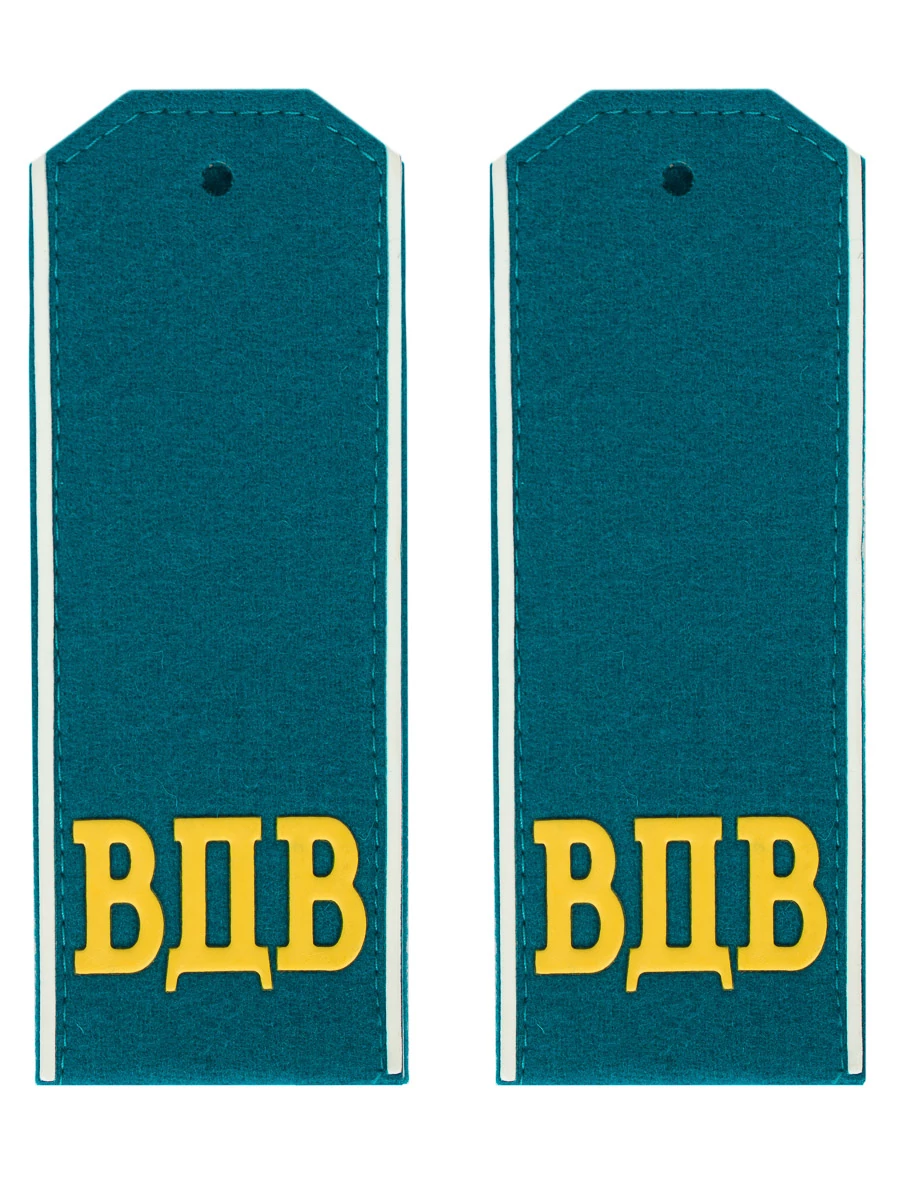 Погоны ВДВ. Погоны голубые праздничные с желтой надписью "ВДВ" и белыми полосами из пластизоля. Размеры: Длина - 14 см, Ширина - 5,5 см. Толщина - 1 мм. Форма: Трапециевидная.