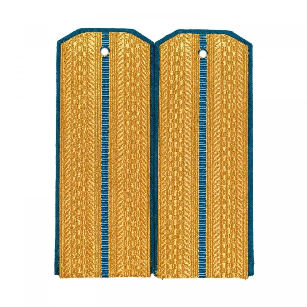 Погоны изготовлены из погонной ленты золотистого цвета с голубым (синим) кантом. Край &39;Трапеция&39;. На каждом погоне предусмотрено отверстие под пуговицу.