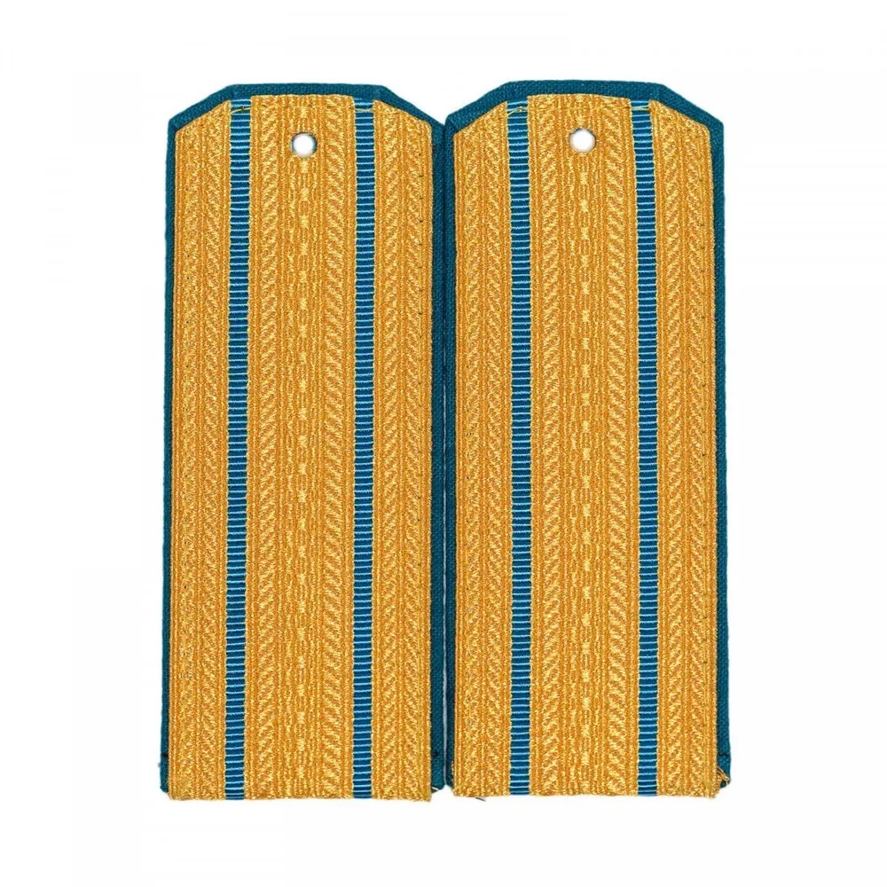 Погоны изготовлены из погонной ленты золотистого цвета с голубым (синим) кантом. Край &39;Трапеция&39;. На каждом погоне предусмотрено отверстие под пуговицу.