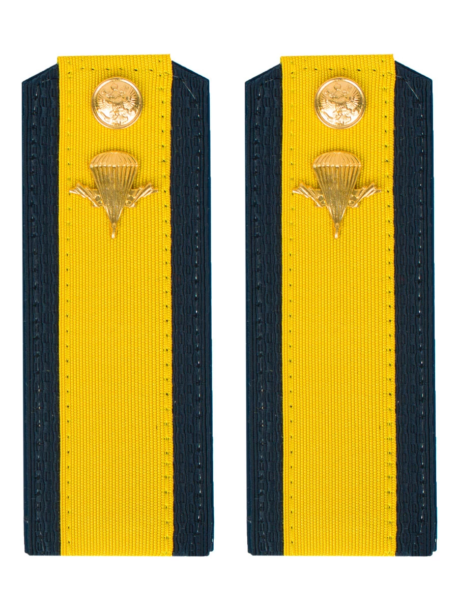 Погоны ВДВ с фурнитурой синие Старшина Пластиковые. Погоны полностью укомплектованы фурнитурой. Погоны ВДВ изготовлены из темно-иней ленты ленты с нашивным желтым галуном (лентой). С оборотной стороны имеются хлястики (полоски ткани) для быстрого крепления на куртку офисной (повседневной) формы. Если погоны будут пришиваться, то хлястик можно отрезать ножницами. На каждом погоне предусмотрено отверстие под пуговицу.