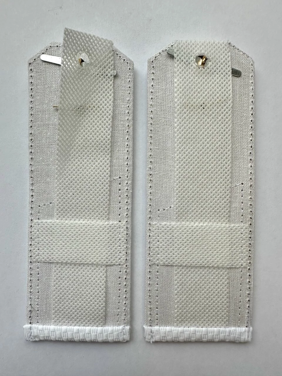 Погоны ВДВ с фурнитурой белые Прапорщик . Погоны полностью укомплектованы фурнитурой. Погоны ВДВ изготовлены из белой ленты. С оборотной стороны имеются хлястики (полоски ткани) для быстрого крепления на куртку офисной (повседневной) формы. Если погоны будут пришиваться, то хлястик можно отрезать ножницами. На каждом погоне предусмотрено отверстие под пуговицу.