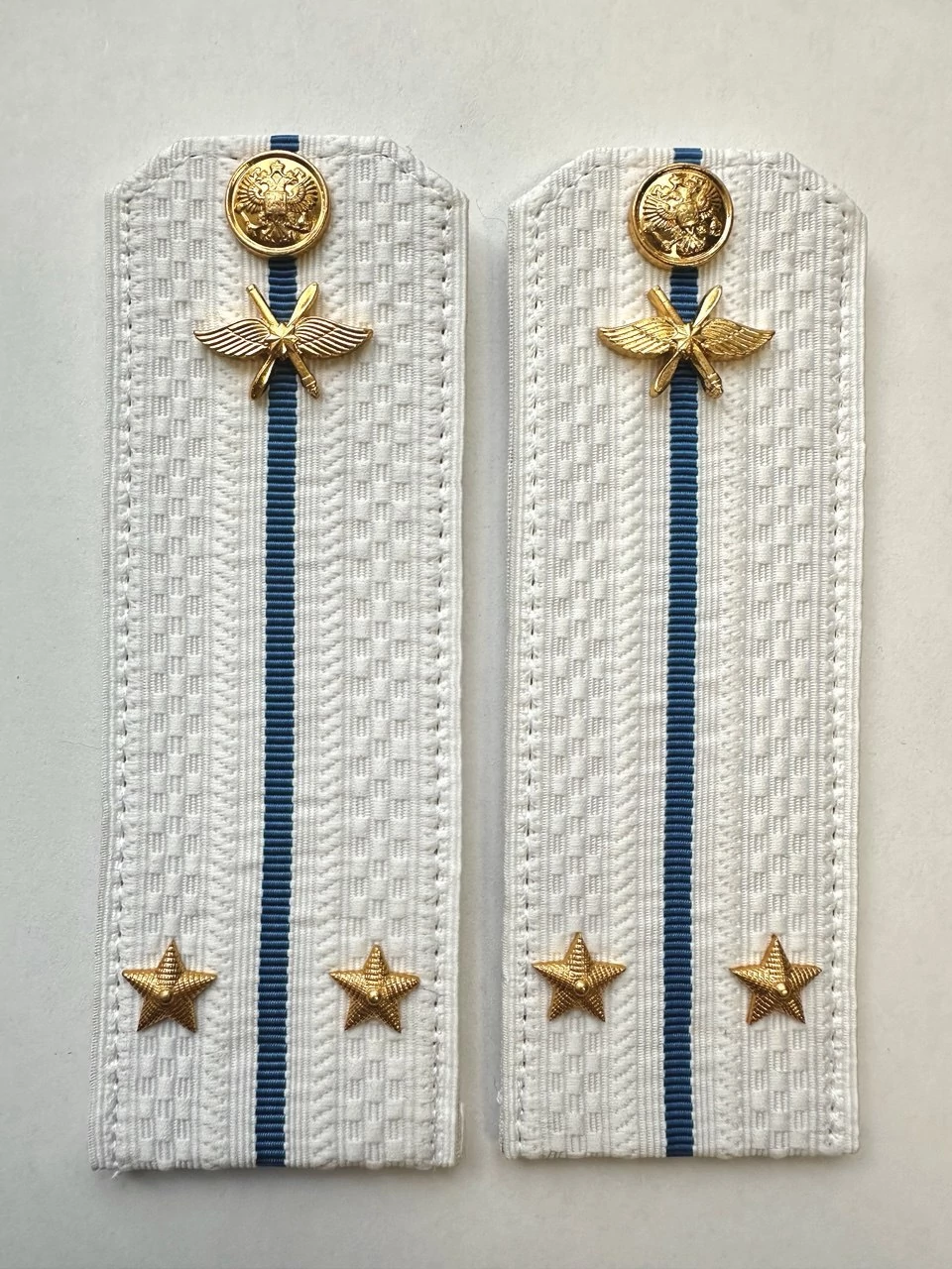 Погоны ВКС ВВС с фурнитурой белые Лейтенант. Погоны полностью укомплектованы фурнитурой. Погоны ВКС ВВС изготовлены из белой ленты. С оборотной стороны имеются хлястики (полоски ткани) для быстрого крепления на куртку офисной (повседневной) формы. Если погоны будут пришиваться, то хлястик можно отрезать ножницами. На каждом погоне предусмотрено отверстие под пуговицу.
