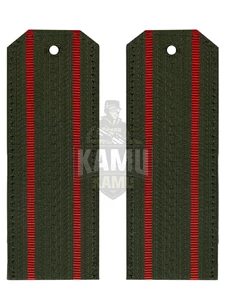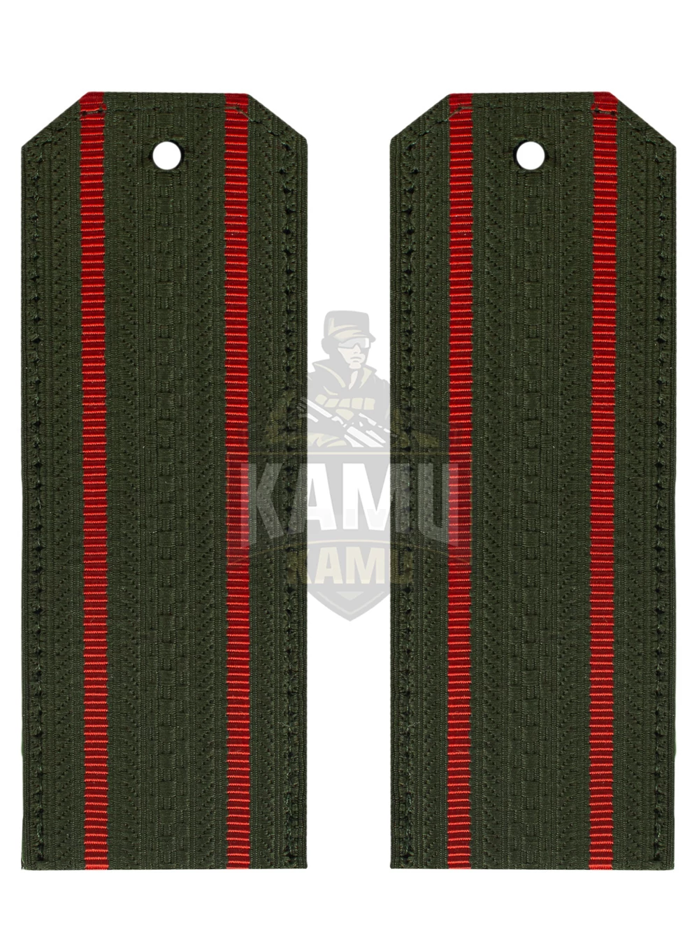 Поле погон выполнено из галунной ленты оливкового цвета с двумя полосками красного цвета (просветом).