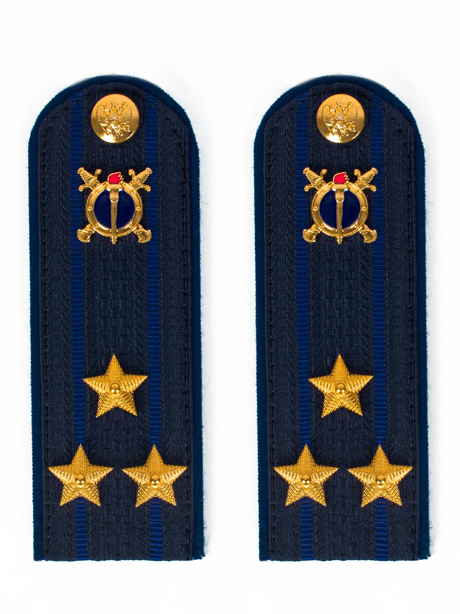 Погоны Юстиции Полковник синие В СБОРЕ 1 пара. Основа: КАРТОН. Размер: 14х5,5см. Ткань: 100% полиэстер. Фурнитура: металл латунь. Форма: Полукруг. Погоны идут сразу в сборе с металлической фурнитурой из латуни и застежкой кляммером. Петличная эмблема сотрудников органов внутренних дел Российской Федерации, имеющих специальные звания юстиции, представляет собой золотистое (желтое) изображение круглого щита, расположенного поверх двух перекрещенных мечей в ножнах рукоятями вверх. В синем поле щита - золотистое (желтое) изображение факела с красным отблеском пламени. На оборотной стороне эмблема имеет приспособление для крепления на форме одежды. Размер эмблемы 22 x 22 мм.