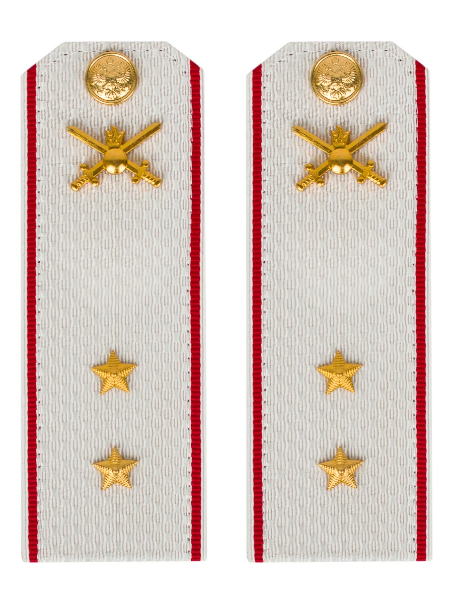 Белые погоны Министерство обороны Сухопутные войска звание Прапорщик на картонной основе размер 14х5см. Погоны белые ткань жаккард, основа картон. Погоны идут сразу в сборе с металлической фурнитурой из латуни и застежкой кляммером. При креплении жестких погон необходимо использовать застежку-кляймер. Необходимо продеть ленту погона в специальные петли на уставной форме.
