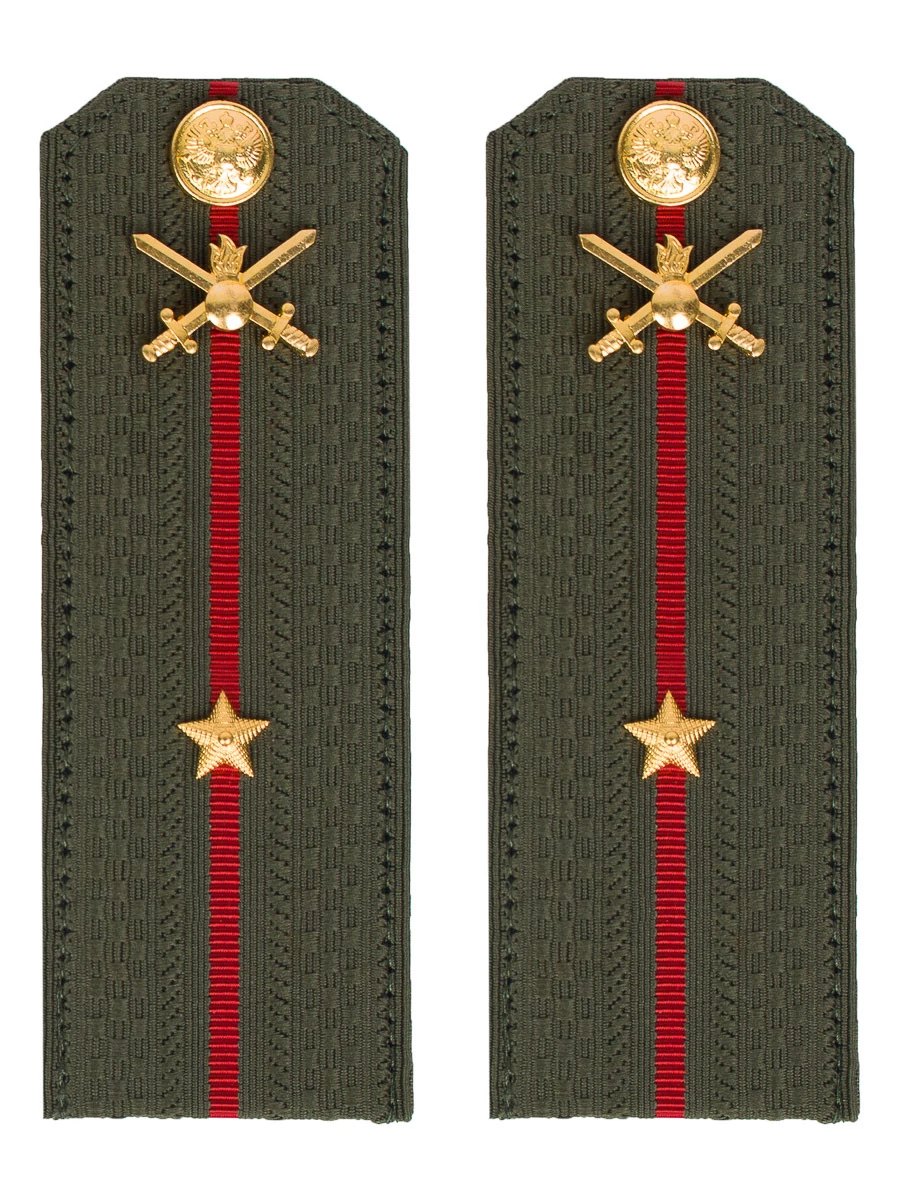 Зеленые погоны Министерство обороны Сухопутные войска звание Младший лейтенант на картонной основе размер 14х5см. Погоны зеленые ткань жаккард, основа картон. Погоны идут сразу в сборе с металлической фурнитурой из латуни и застежкой кляммером. При креплении жестких погон необходимо использовать застежку-кляймер. Необходимо продеть ленту погона в специальные петли на уставной форме.