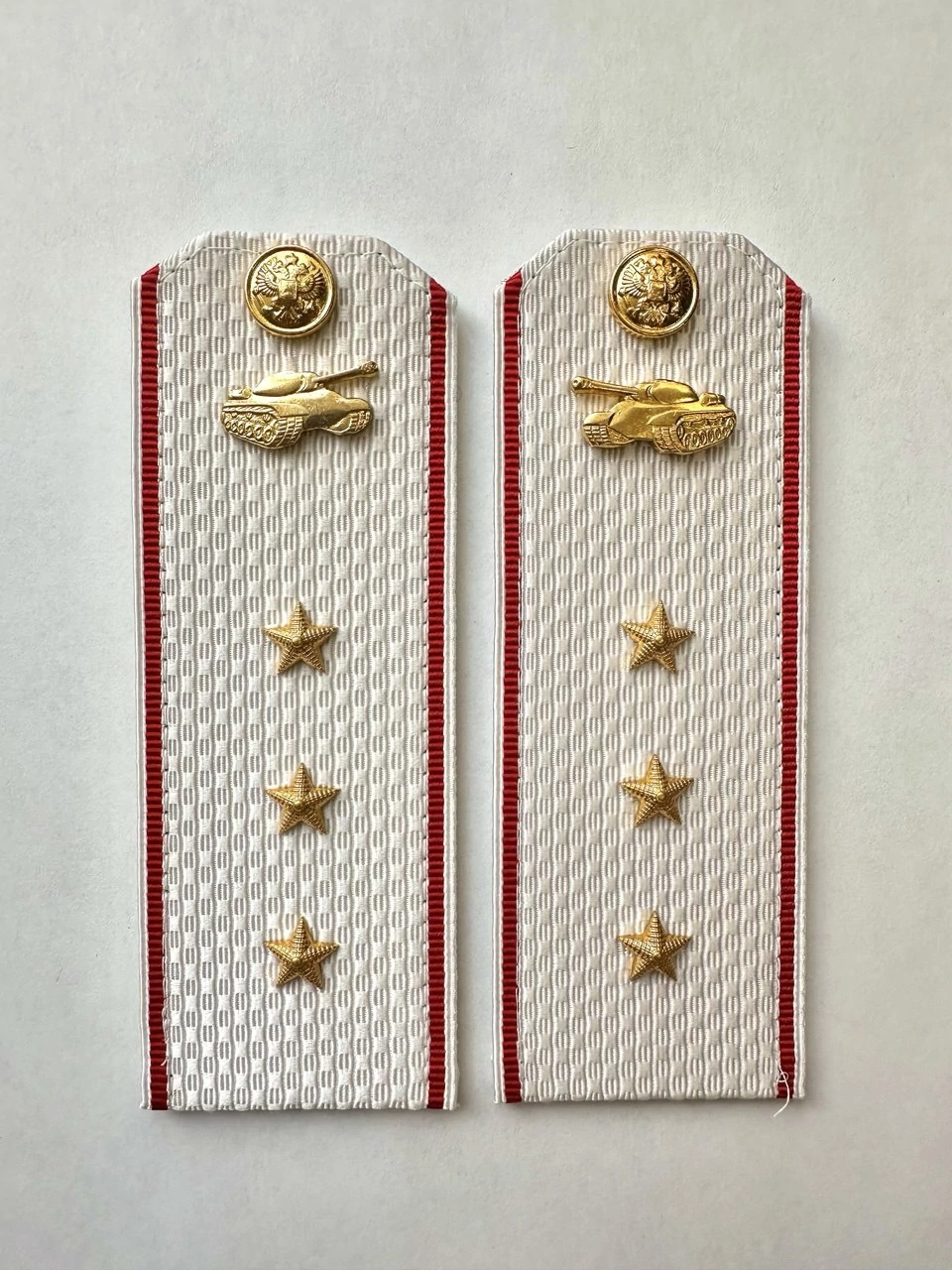 Белые погоны Министерство обороны Танковые войска звание Старший Прапорщик на картонной основе размер 14х5см. Погоны белые ткань жаккард, основа картон. Погоны идут сразу в сборе с металлической фурнитурой из латуни и застежкой кляммером. При креплении жестких погон необходимо использовать застежку-кляймер. Необходимо продеть ленту погона в специальные петли на уставной форме.