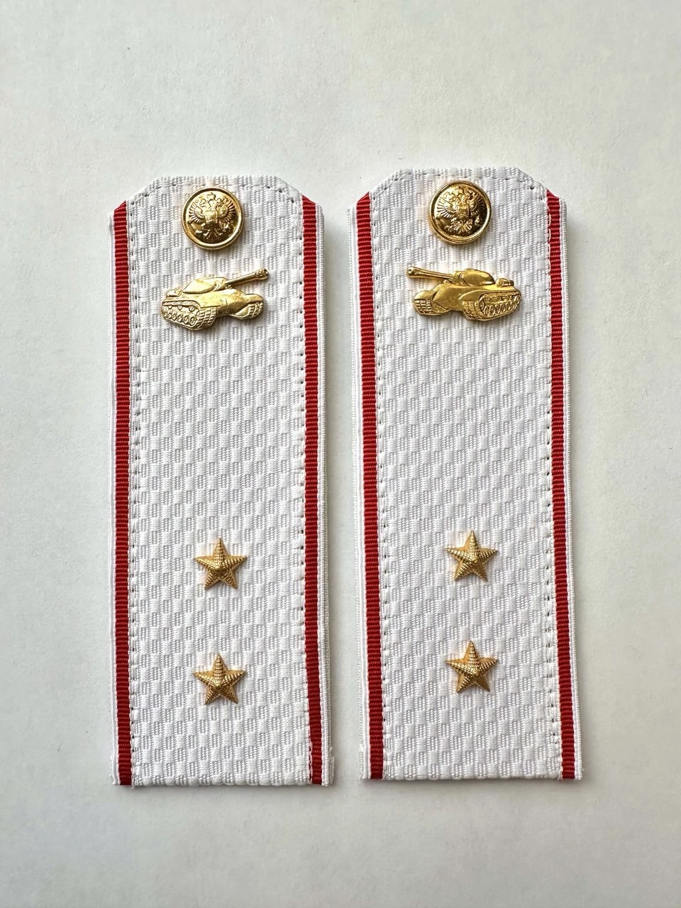 Белые погоны Министерство обороны Танковые войска звание Прапорщик на картонной основе размер 14х5см. Погоны белые ткань жаккард, основа картон. Погоны идут сразу в сборе с металлической фурнитурой из латуни и застежкой кляммером. При креплении жестких погон необходимо использовать застежку-кляймер. Необходимо продеть ленту погона в специальные петли на уставной форме.