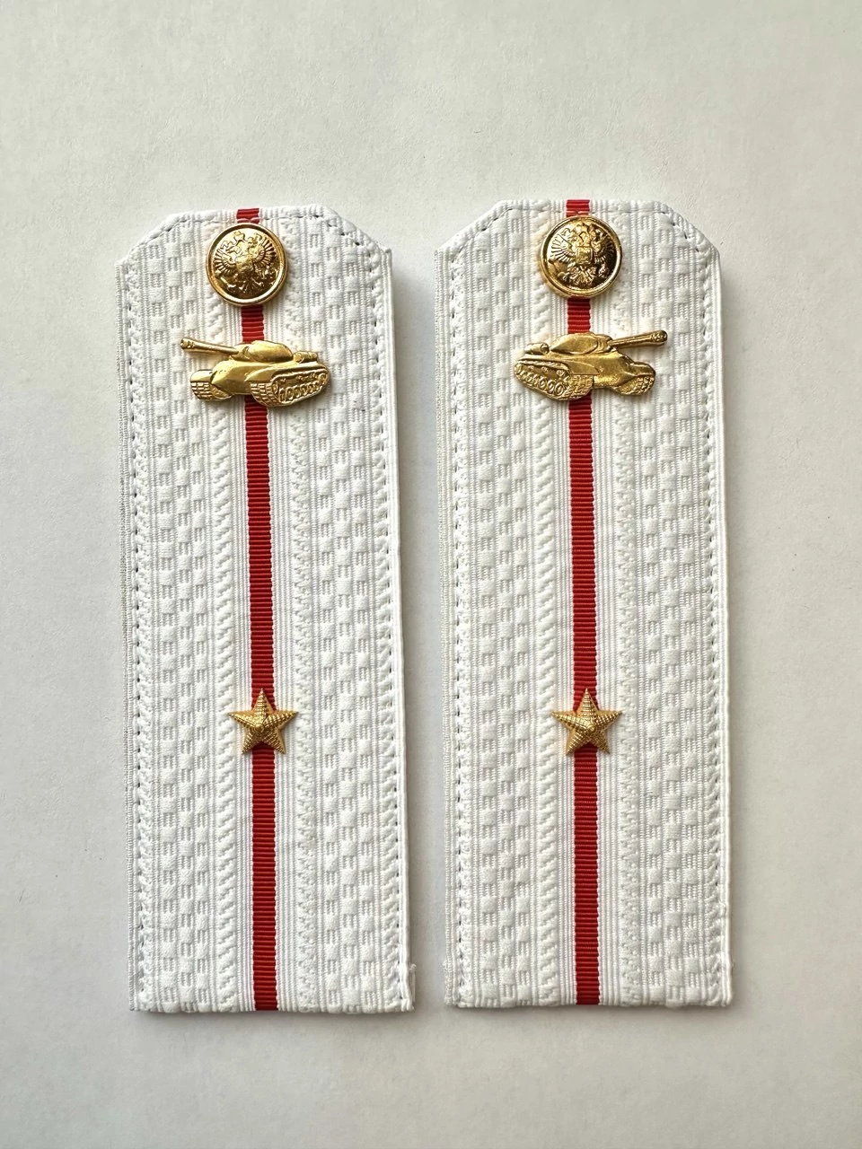 Белые погоны Министерство обороны Танковые войска звание Младший Лейтенант на картонной основе размер 14х5см. Погоны белые ткань жаккард, основа картон. Погоны идут сразу в сборе с металлической фурнитурой из латуни и застежкой кляммером. При креплении жестких погон необходимо использовать застежку-кляймер. Необходимо продеть ленту погона в специальные петли на уставной форме.