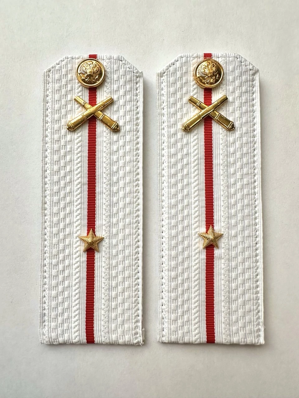 Белые погоны Министерство обороны РВиА звание Младший Лейтенант на картонной основе размер 14х5см. Погоны белые ткань жаккард, основа картон. Погоны идут сразу в сборе с металлической фурнитурой из латуни и застежкой кляммером. При креплении жестких погон необходимо использовать застежку-кляймер. Необходимо продеть ленту погона в специальные петли на уставной форме.
