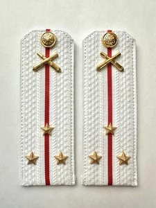 Белые погоны Министерство обороны РВиА звание Старший Лейтенант на картонной основе размер 14х5см. Погоны белые ткань жаккард, основа картон. Погоны идут сразу в сборе с металлической фурнитурой из латуни и застежкой кляммером. При креплении жестких погон необходимо использовать застежку-кляймер. Необходимо продеть ленту погона в специальные петли на уставной форме.