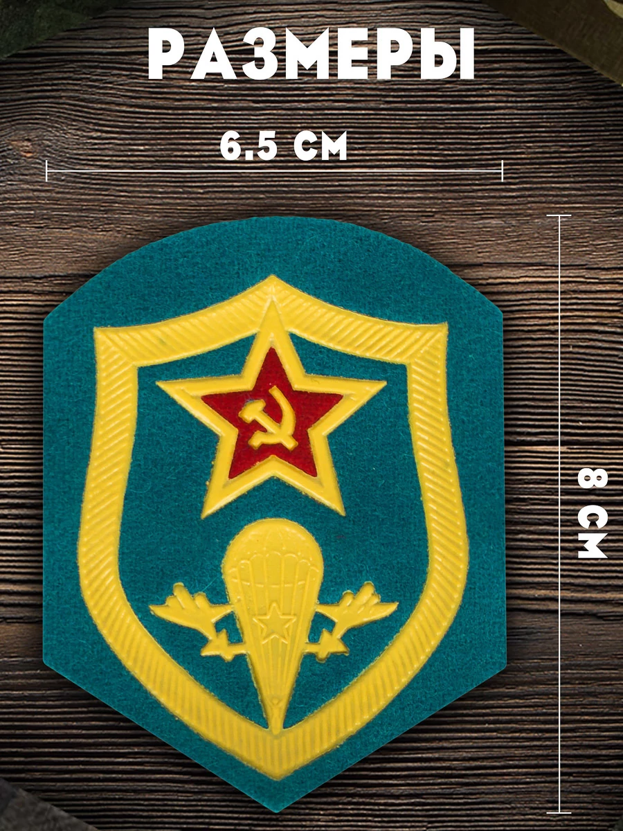 Ярко-голубой шеврон воздушно-десантных войск армии Советского Союза. На шевроне изображена эмблема ВДВ СССР - парашют и самолеты желтого цвета под красной звездой с серпом и молотом. Фетровый шеврон укреплен хлопковой подкладкой, но его необходимо пришивать к форме нитками в тон, так как крепление-липучка (велкро) у него отсутствует.