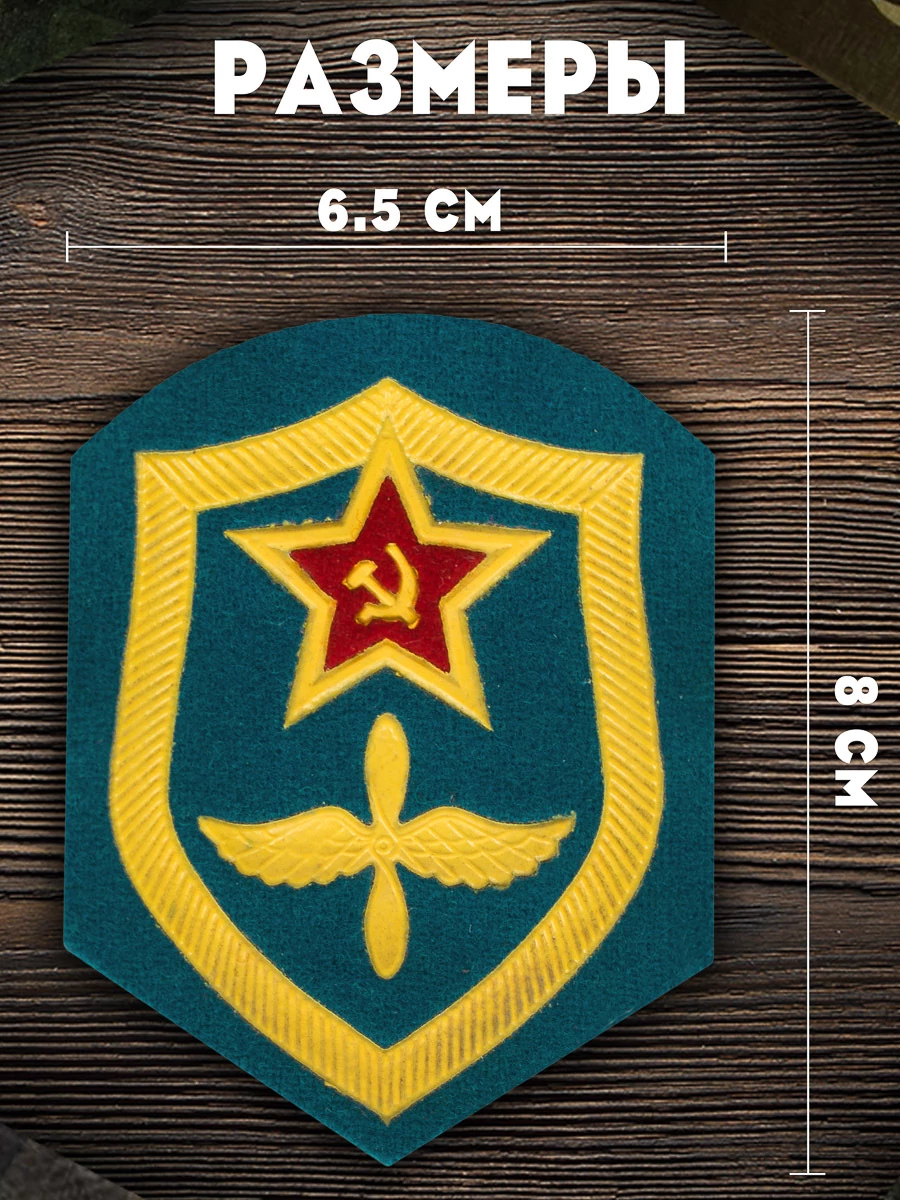 Ярко-голубой шеврон ВВС армии Советского Союза. На шевроне изображена эмблема ВВС СССР. Фетровый шеврон укреплен хлопковой подкладкой, но его необходимо пришивать к форме нитками в тон, так как крепление-липучка (велкро) у него отсутствует.
