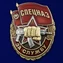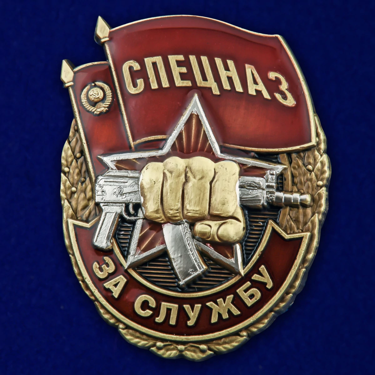 В центре рельефное стилизованное изображение эмблемы - звезда, кулак с автоматом. В верхней части развивается флаг с надписью: "СПЕЦНАЗ", за ним флаг с гербом СССР. В нижней части знака расположена лента красного цвета с золотистой надписью: "ЗА СЛУЖБУ".